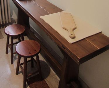 Italian style kitchen with separate breakfast table area, electric fan assisted oven, gas hob, microwave, kettle and toaster. All cooking equipment and utensils provided. Next to the kitchen there is a utility room with washing machine and additional storage space.